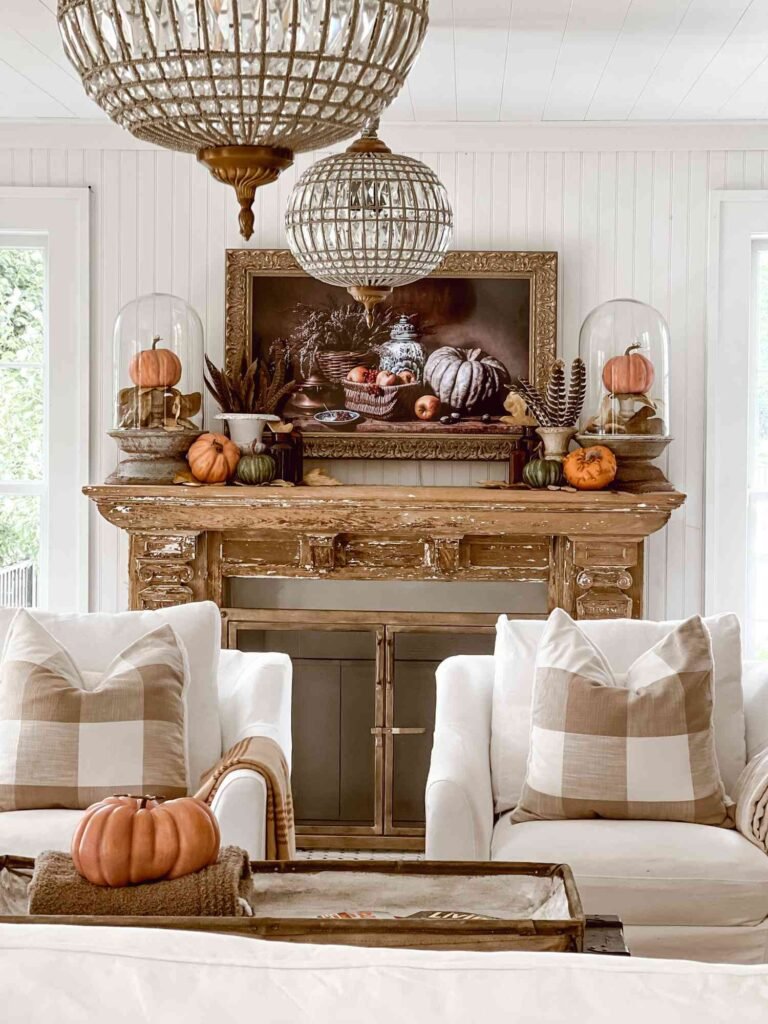 This fun fall update of my enclosed porch was simple and inexpensive, yet created a cozy retreat for the season! I brought in neutral with pops of warmth through throw pillows and a plaid blanket, and added a few touches of my own, including homemade wreaths and painted pumpkins, to the space to make it feel cozy and lived in. And given how mild the weather is down here in the South, deep into fall, the arrangement turned into perfect opportunities to grab some cool air and see some colors. If you’re needing diy home decor ideas for the living room or front porch, a seasonal lift like this infuses charm and doesn’t cost a fortune.
